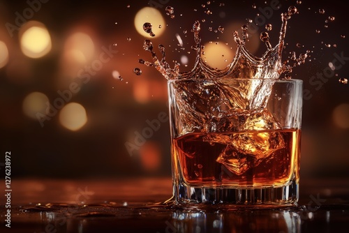 Macro shot of whiskey pouring with splash in a glass highlighting dramatic lighting