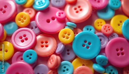 Macro view of colorful sewing buttons scattered across surface. Assortment includes vivid pink, yellow, blue, orange buttons with four holes. Perfect for craft projects, fashion design, scrapbooking
