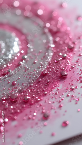 Macro view of glitter glue’s magical texture. Pink-silver particles, air bubbles, and fingerprints make this craft moment mesmerizing.