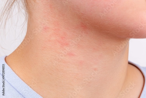 Macro View of Skin Under Jaw Featuring Faint Red Markings Highlighting Texture and Condition, Revealing Subtle Variations in Skin Tone and Surface Imperfections Common in Skin Health Examinations