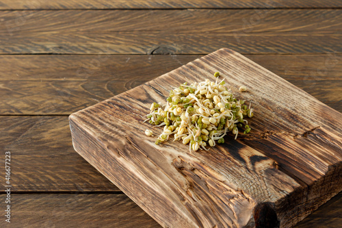 Macrobiotic food. Sprouted mung beans ready to eat on wooden serving board. Rustic style