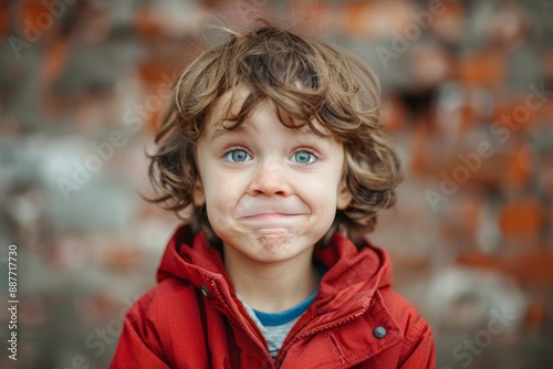 Mad child, angry little kid standing and looking at the camera with upset face expression. Unhappy toddler, annoyed and frustrated emotion, little boy