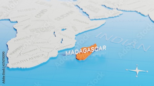 Madagascar highlighted on a white simplified 3D world map. Digital 3D render.