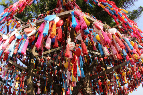 Mae Hong Son Province, Thailand - Jan 1, 2020: Colorful heart shaped key rings hanging around a tree as a souvenir to visit. Yon Lai Viewpoint