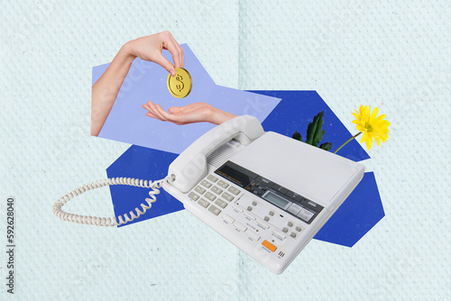 Magazine banner collage of two hands giving receive golden coins via telephone money transaction concept