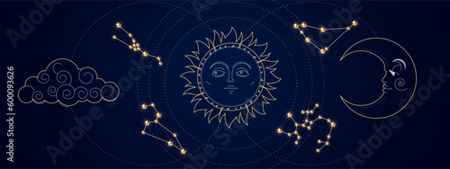 Magic astrology sky with Zodiac constellations, crescent moon, sun and stars.