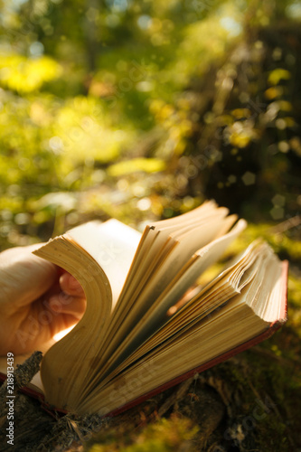 magic book glowing with yellow lights against the beautiful green forest, mystery, spiritual closeup