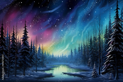 Magic Christmas trees forest in winter with northern lights Generative AI