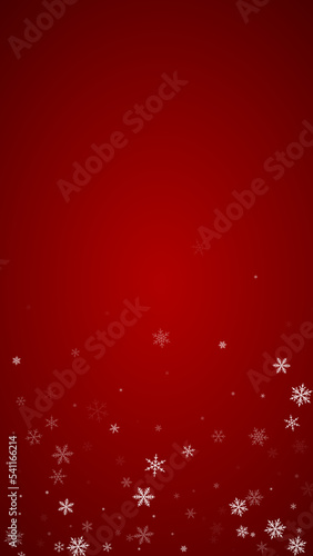 Magic falling snow christmas background. Subtle flying snow flakes and stars on christmas red background. Magic falling snow holiday scenery. Vertical vector illustration.