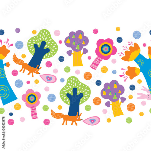 Magic forest. Horizontal border seamless pattern in cartoon style.