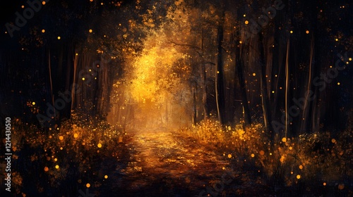 Magical Autumn Forest Path Golden Glow Fireflies Night