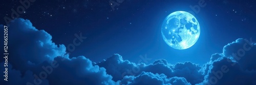Magical blue night, bright full moon, fluffy clouds, sparkling stars, cloud, clouds, starlit