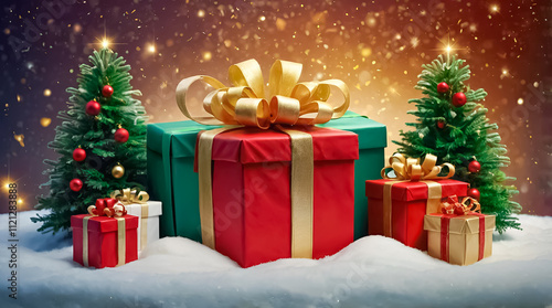 Magical Christmas Gift Box Scene with Vibrant Red and Green Presents, Golden Ribbons, Snowy Landscape, and Decorated Christmas Trees in a Sparkling Holiday Atmosphere