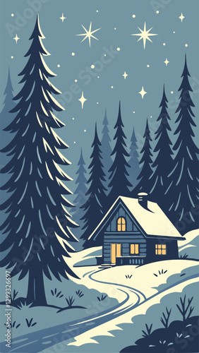 Magical Christmas night background with snowy forest, glowing fairy lights, twinkling stars, and soft falling snow covering evergreen trees in a peaceful winter landscape under a starry sky