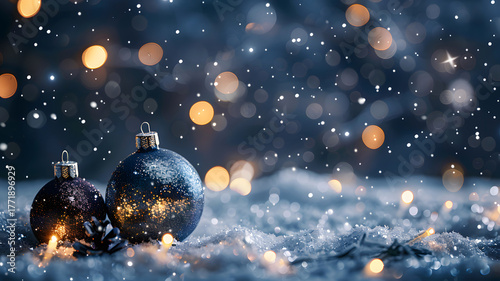 Magical christmas ornaments on snowy ground with bokeh lights