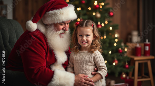 Magical Christmas Portrait: Child Capturing Heartwarming Moment with Santa Claus Under Festive Lights