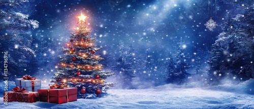 Magical Christmas Tree in Snowy Winter Wonderland with Presents