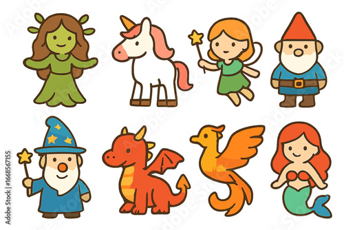 Magical Creatures Icons. Flat vector mini-illustrations magical beings in colors children's illustrations: dryad, unicorn, fairy,