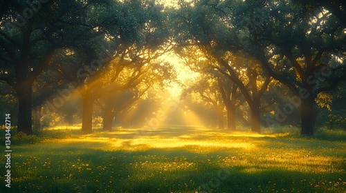 Magical dawn in a lush park with towering oak trees
