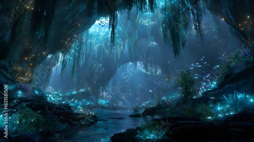 Magical Enchanted Forest Cave with Glowing Blue Lights and Mystical Atmosphere