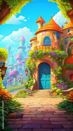 Magical Fairytale Castle Landscape. Cozy Atmosphere. Vibrant Cartoon Background. Fantasy Illustration