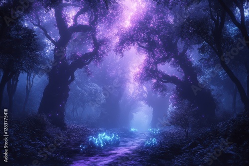 Magical Forest Path Glowing Trees Night Scene Fantasy World,