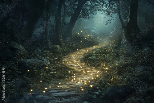 Magical forest path illuminated by glowing lights and firefly hearts dark night trees green stone