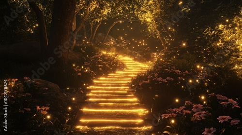 Magical Forest Path Illuminated by Golden Lights with Enchanting Atmosphere and Fireflies
