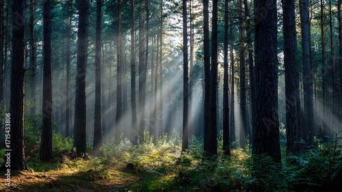 "Magical Forest Scene with Sunlight Beams Through Trees – Nature Landscape Photography"