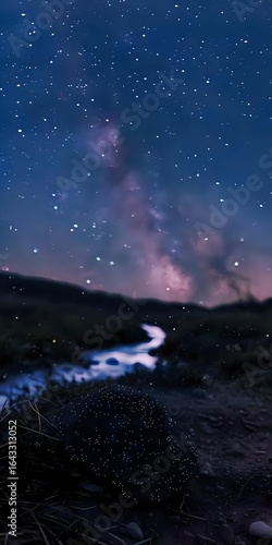 Magical night landscape with winding river reflecting starry sky and Milky Way galaxy, dark silhouette of mountains against purple-blue cosmic background.