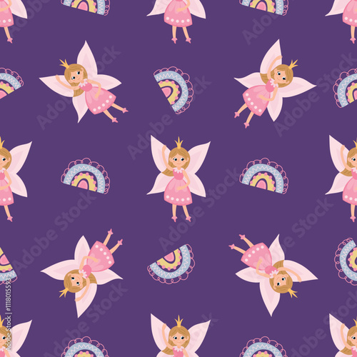 Magical Seamless Pattern with Fairies. Design for fabric, textile, wallpaper, packaging, nursery.