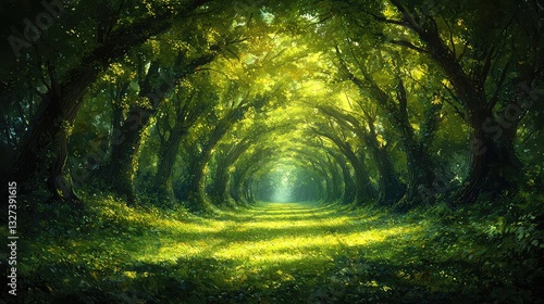 Magical Sunlit Forest Path: Lush Green Canopy Tunnel, Sunlight Dappled Meadow, Tranquil Nature Scene, Serene Path Through Trees