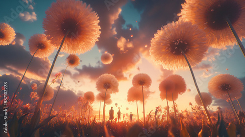 magical sunset landscape with dandelion flowers and silhouettes of people