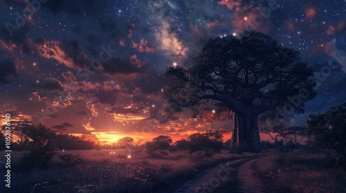Magical Sunset with Baobab Tree and Milky Way Galaxy
