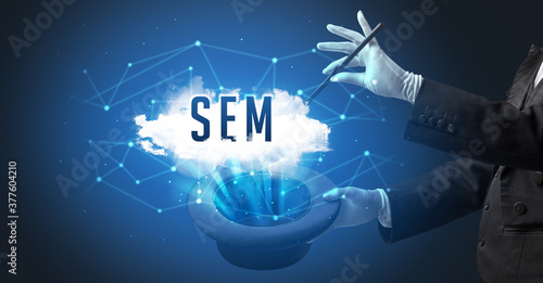 Magician is showing magic trick with SEM abbreviation, modern tech concept