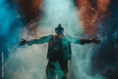 Magician levitates, flies surrounded by smoke on stage