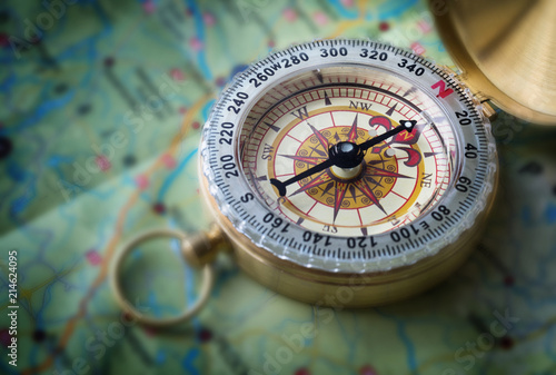 Magnetic compass on world map.Travel, geography, navigation, tourism and exploration concept background. Macro photo. Very shallow focus.