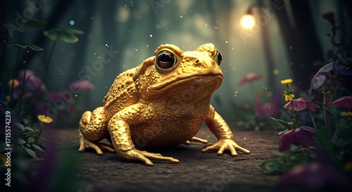 Magnificent Golden Toad in a Magical Forest with Glowing Lights and Flowers