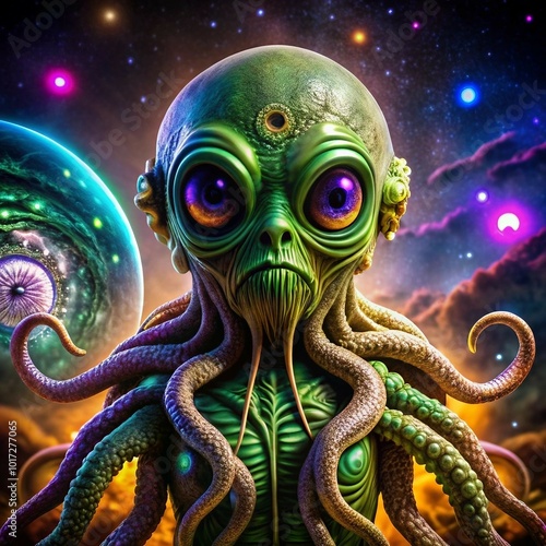 Magnificent octopus alien with purple and green tentacles fantasy art concept. whimsically fantastical manner a beautiful alien planet