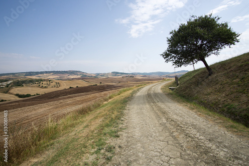 Magnificent Tuscan rolling hills landscape in the Val d"Orcia Valley. World heritage site in Tuscany Italy on July 2019