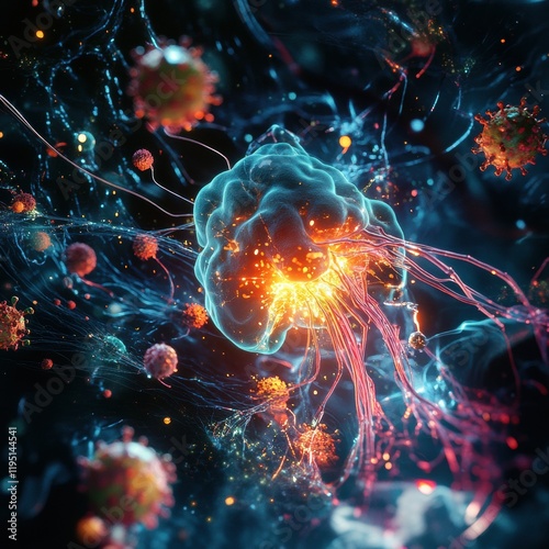 Magnified view of a human cell under attack by multiple viruses in a dramatic scientific illustration. Generative AI