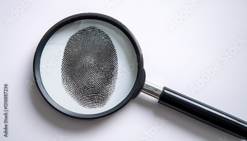 Magnifying glass and black fingerprint ink on white. Biometric identification for forensic purposes.