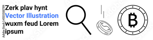 Magnifying glass, coins with dollar and bitcoin symbols illustrate financial analysis, money, cryptocurrency, investment, economic research, and digital currency. Ideal for fintech, blockchain
