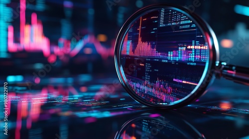 Magnifying glass enlarging the electronic circuit board with processor background, a magnifying glass is placed on a computer display showing data analysis