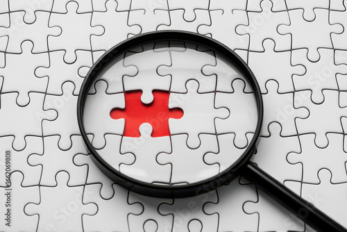 Magnifying glass focuses on missing red puzzle piece among white pieces, symbolizing search, discovery, and problem solving with sense of curiosity and attention to detail