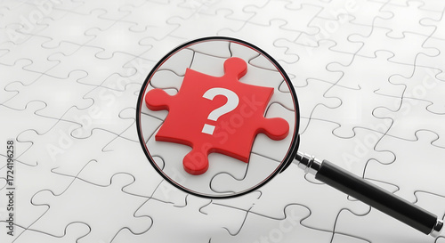 Magnifying glass focusing on a red puzzle piece with question mark