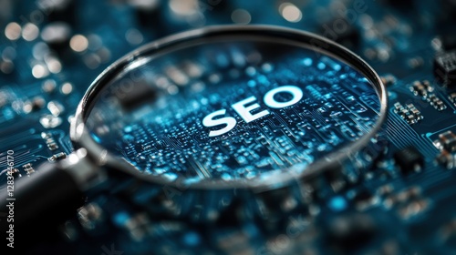 Magnifying glass focusing on SEO text over circuit board representing digital marketing strategy and search engine optimization