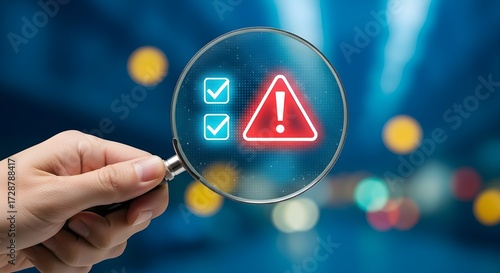 Magnifying glass highlighting a red warning sign with checkmarks.