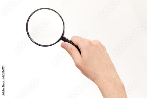 Magnifying glass in hand isolated on white background