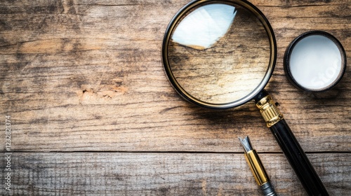 Magnifying Glass Inkwell And Nib On Wooden Surface